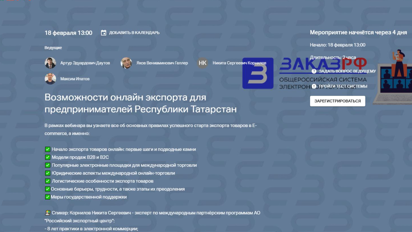 Вебинар «Татарстан Республикасы Дәүләт заказы агентлыгы» АҖ генераль директоры Геллер Яков Вениаминович һәм "Россия экспорт үзәге" АҖнең халыкара партнерлык программалары буенча эксперты Корнилов Никита Сергеевич катнашында уздырыла.