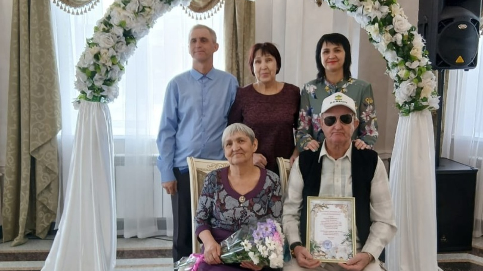 ЗАГС хезмәткәрләре аларга юбилей таныклыгы тапшырдылар һәм ныклы сәламәтлек, озын гомер, иминлек һәм яңа юбилейлар теләделәр!