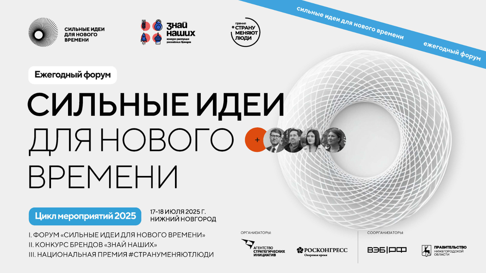 Россия Федерациясе Президенты В. В. Путинның «Яңа заман өчен көчле идеяләр" форумын әзерләү һәм уздыру буенча оештыру комитеты турында» Указы һәм «Яңа проектларны алга җибәрү буенча стратегик инициативалар агентлыгы» автоном коммерцияле булмаган оешмасының (алга таба — агентлык) күзәтчелек советы утырышы йомгаклары буенча Россия Федерациясе Президенты йөкләмәләре исемлегенең 7 пунктындагы «б» пунктчасы нигезендә, агентлык «Росконгресс» фонды белән берлектә ел саен үткәрелә торган «Яңа заман өчен көчле идеяләр» форумына әзерлек һәм аны үткәрүне оештыра (алга таба — Форум) һәм үсеп килүче «Безнекеләрне бел» Россия брендлары конкурсы (алга таба — Конкурс), шулай ук Россия Федерациясе Президенты В.В. Путинның 29.06.2024 № пр-1240 йөкләмәсенең 7 пунктындагы «а» пунктчасы нигезендә агентлык «Росконгресс» фонды белән берлектә Россия Федерациясе Оборона министрлыгы ярдәмендә беренче тапкыр ел саен «Илне кешеләр үзгәртә» премиясен (алга таба — Премия) үткәрүне оештыра.