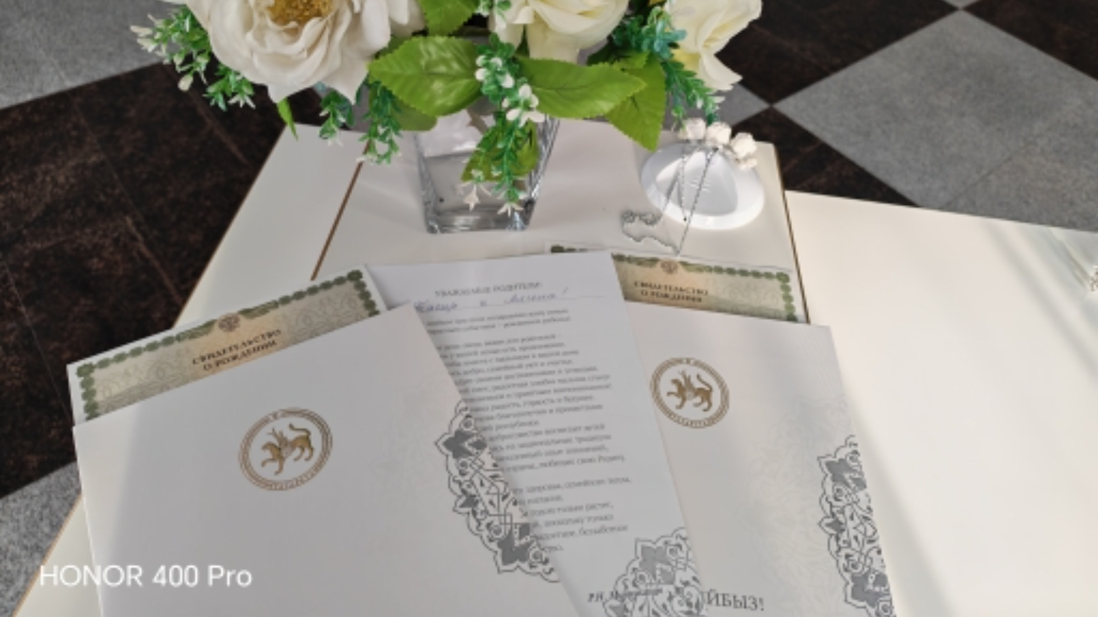 Бәхетле әтигә сабыйларның беренче документлары-туу турында таныклыклар һәм Татарстан Республикасы Рәисеннән котлау адреслары тапшырылды.