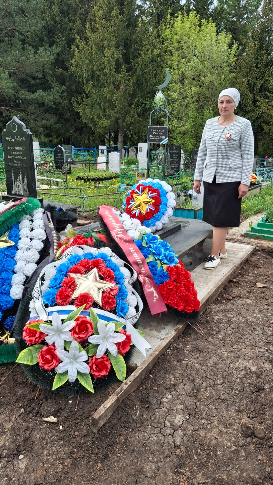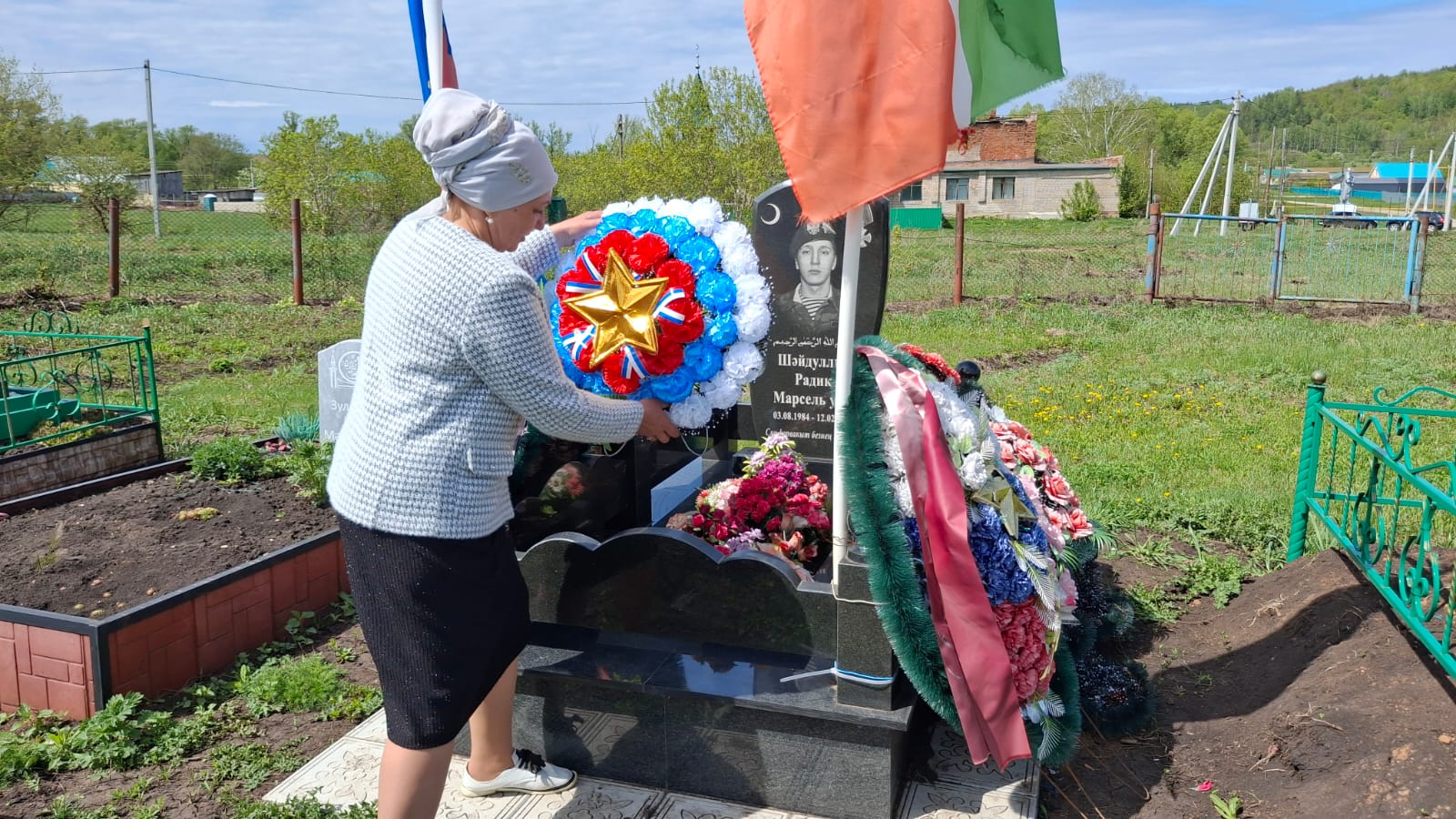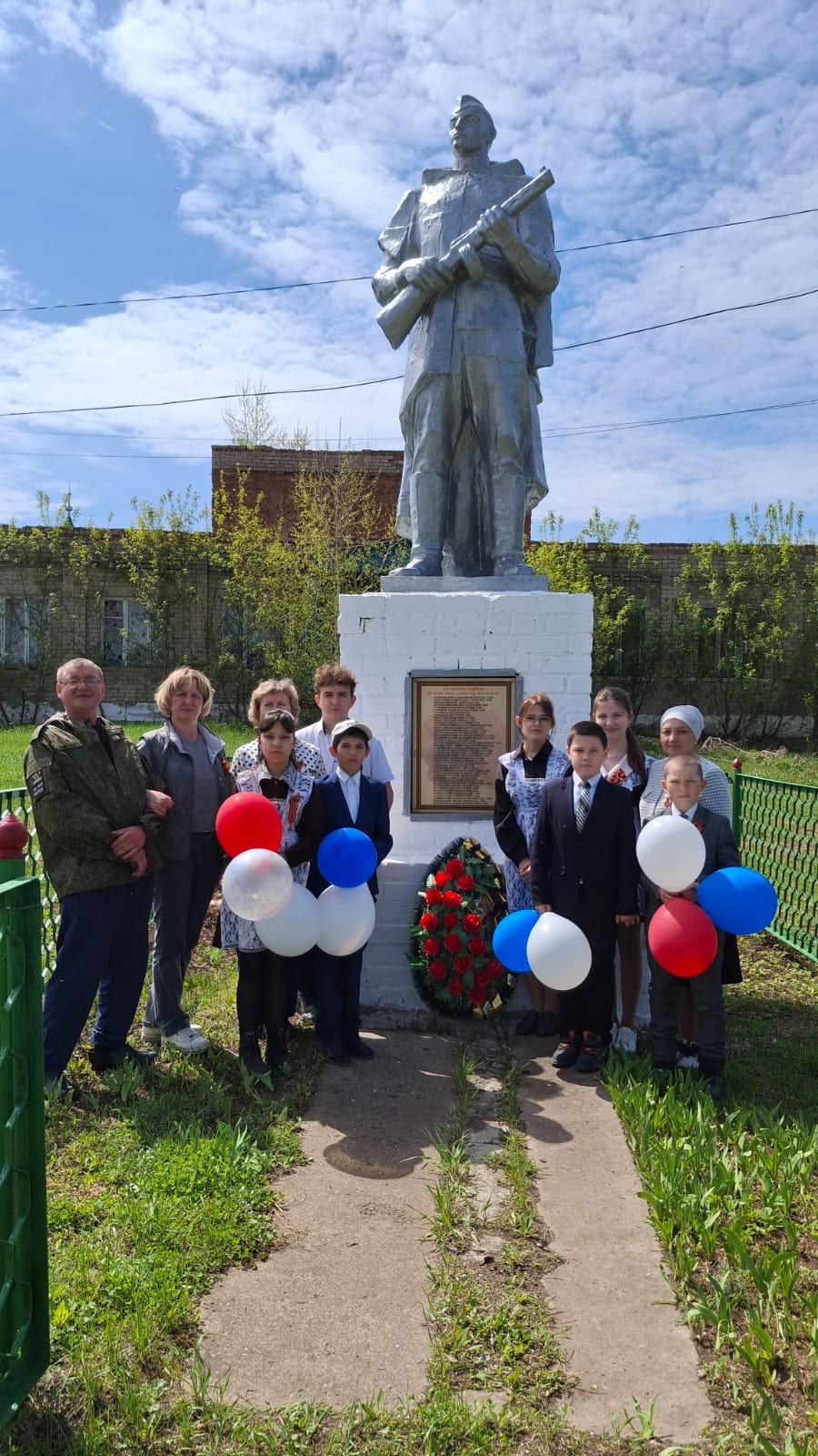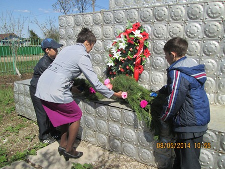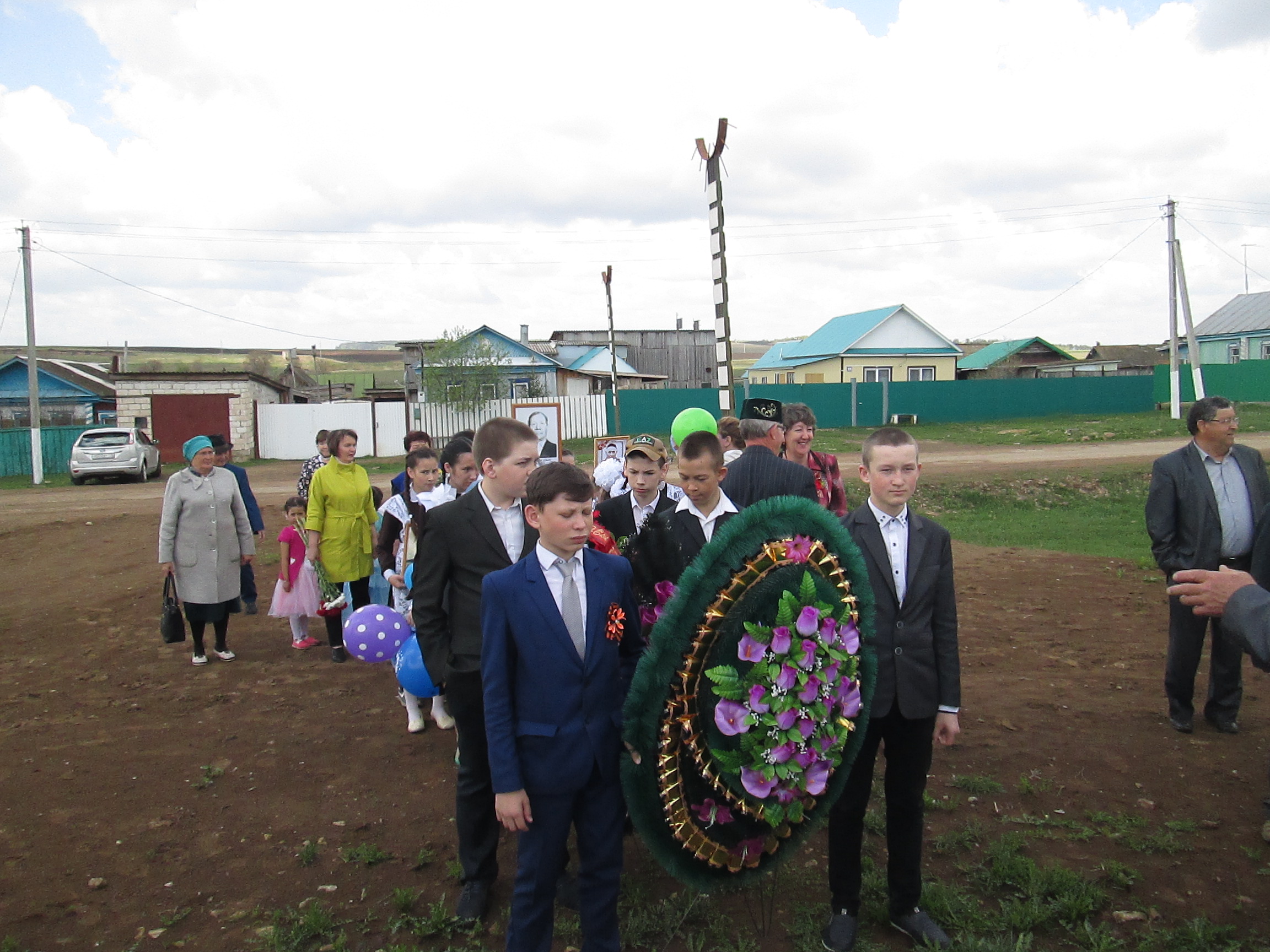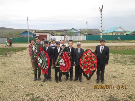 После поздравлений Главы поселения Марата Мансуровича Зиганшина прошла церемония возложения венков к памятнику погибших воинов, почтили память минутой молчания.
