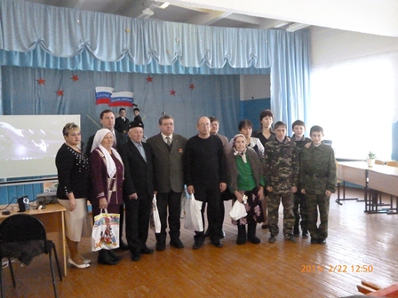 23 февраля прошло торжественное мероприятие посвященный Дню защитника отечества и 30 летию вывода войск из Афганистана. Родителям погибших афганцев и самим участникам боевых действий в Афганистане были вручены подарки от Администрации СП.